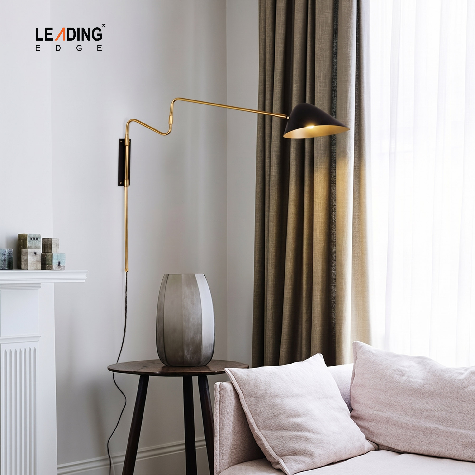 Space-Saving Swing Arm: Replaces traditional lamps with a sleek, wall-anchored system that reaches over sofas or headboards.