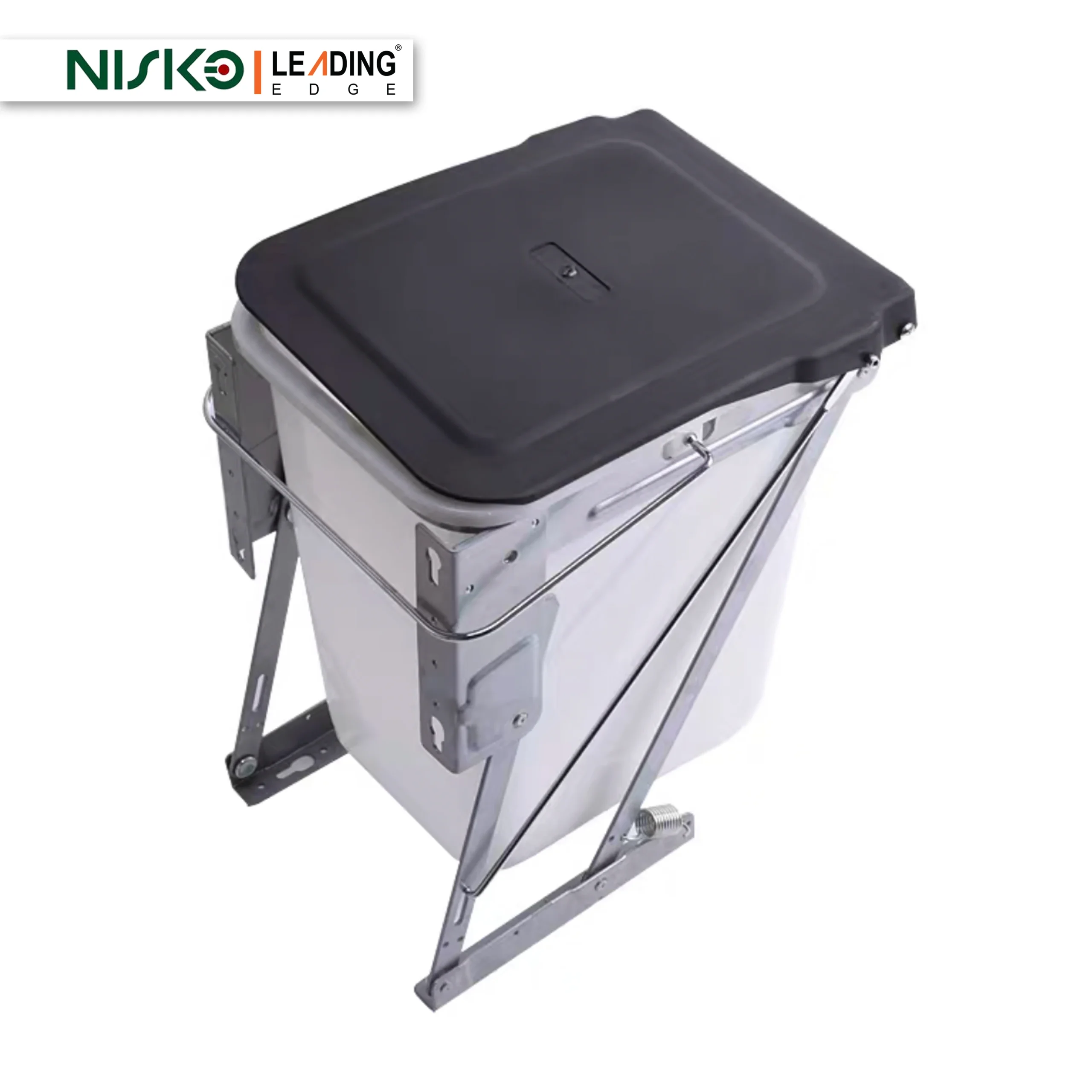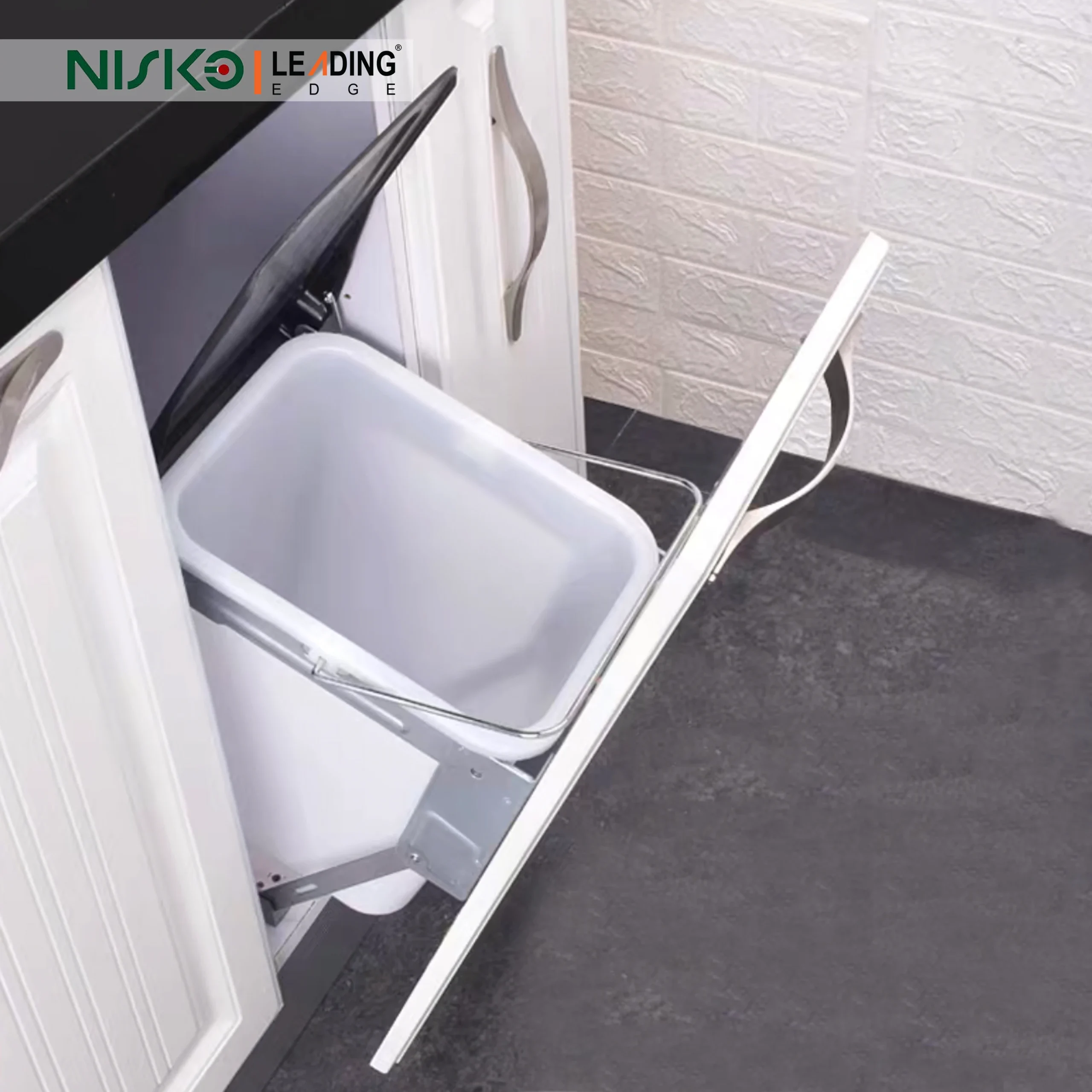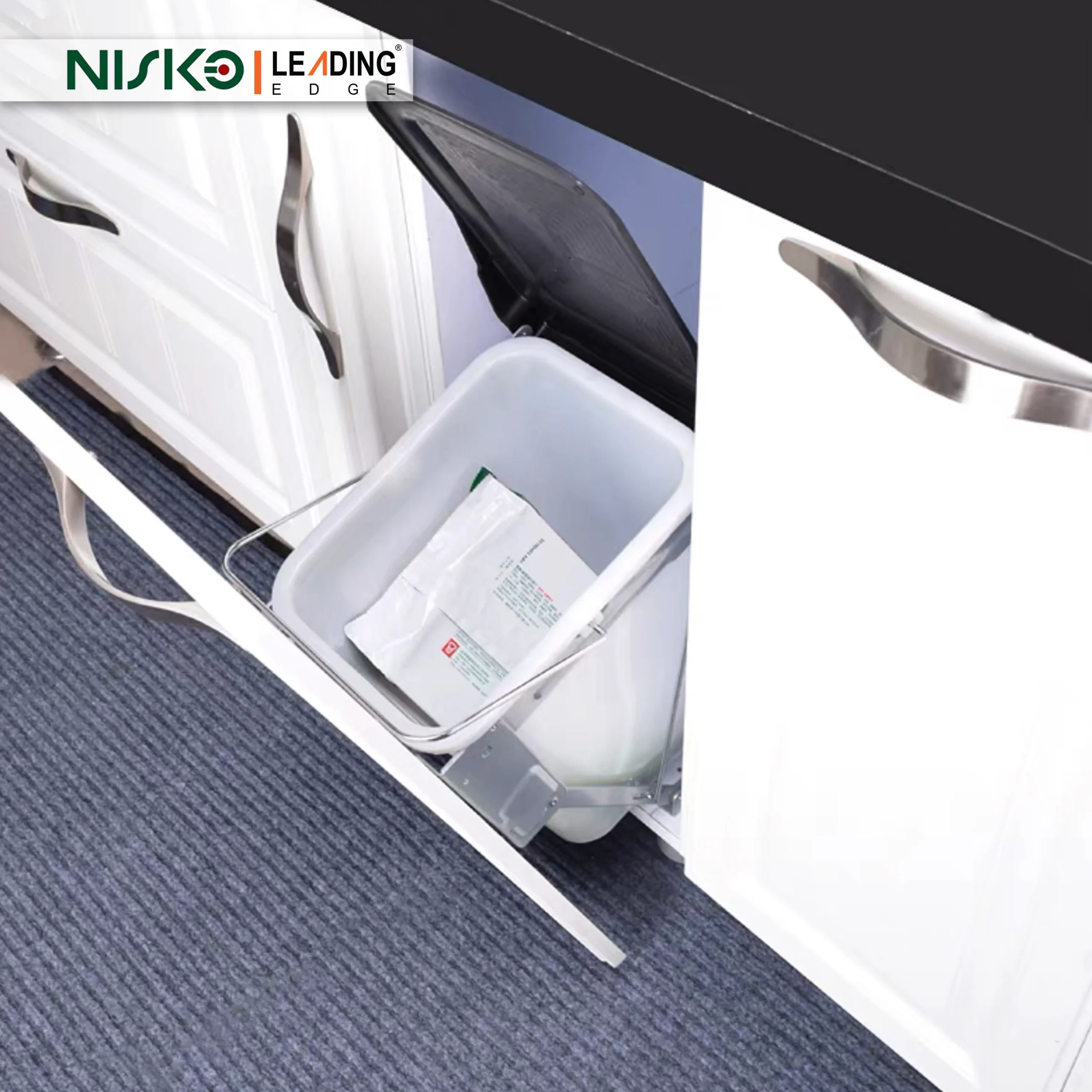 This dustbin features a sophisticated smooth tilting system that automatically lifts the bin when the cabinet door is opened. This hands-free operation allows for easy waste disposal without the need for bending or manual lifting, significantly improving kitchen hygiene and reducing physical strain during daily use.