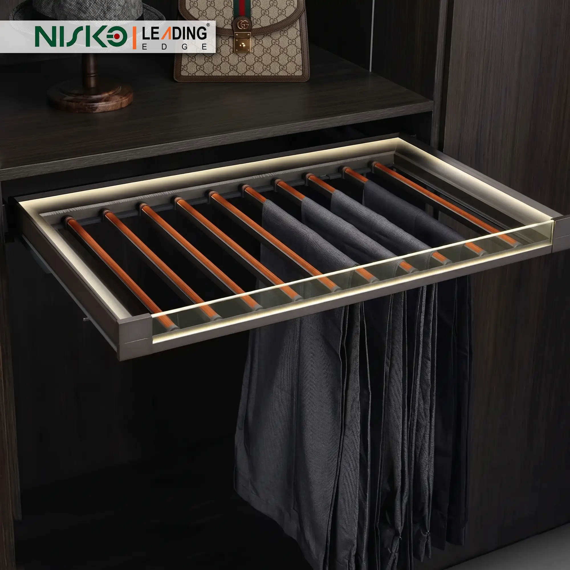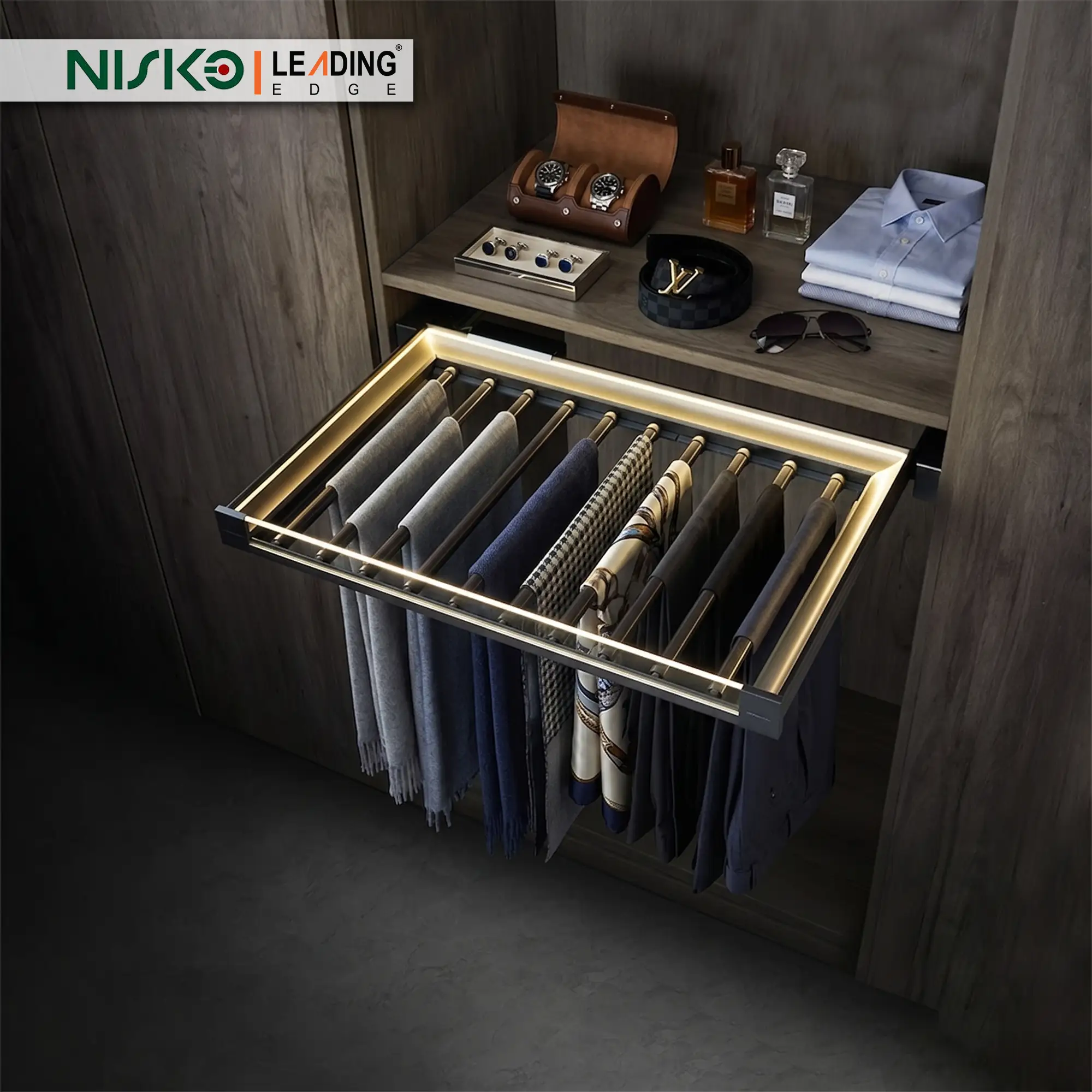 Integrated LED Lighting System Form meets function with the integrated LED lighting system mounted along the frame, providing soft, shadow-free illumination. The motion-activated light automatically brightens dark wardrobe corners as the rack is pulled out, ensuring effortless outfit selection even in low-light environments.
