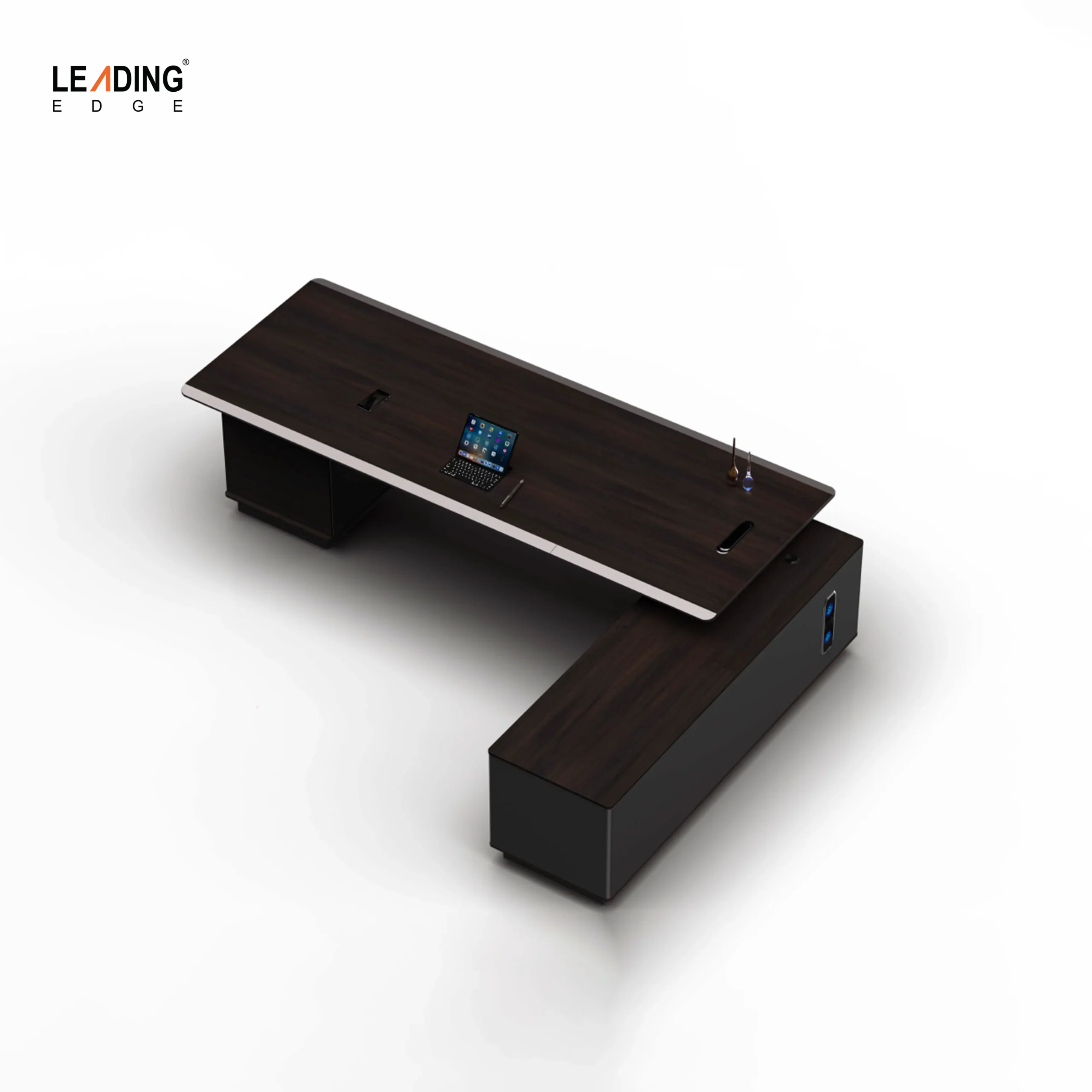 Executive-Grade Storage Supporting the main desk is a substantial L-shaped side cabinet that anchors the unit. This expansive storage solution replaces clutter with organization, housing ample shelving and drawers for documents and personal effects. The unit is modular, allowing for left- or Right-side installation to perfectly match your room’s layout.