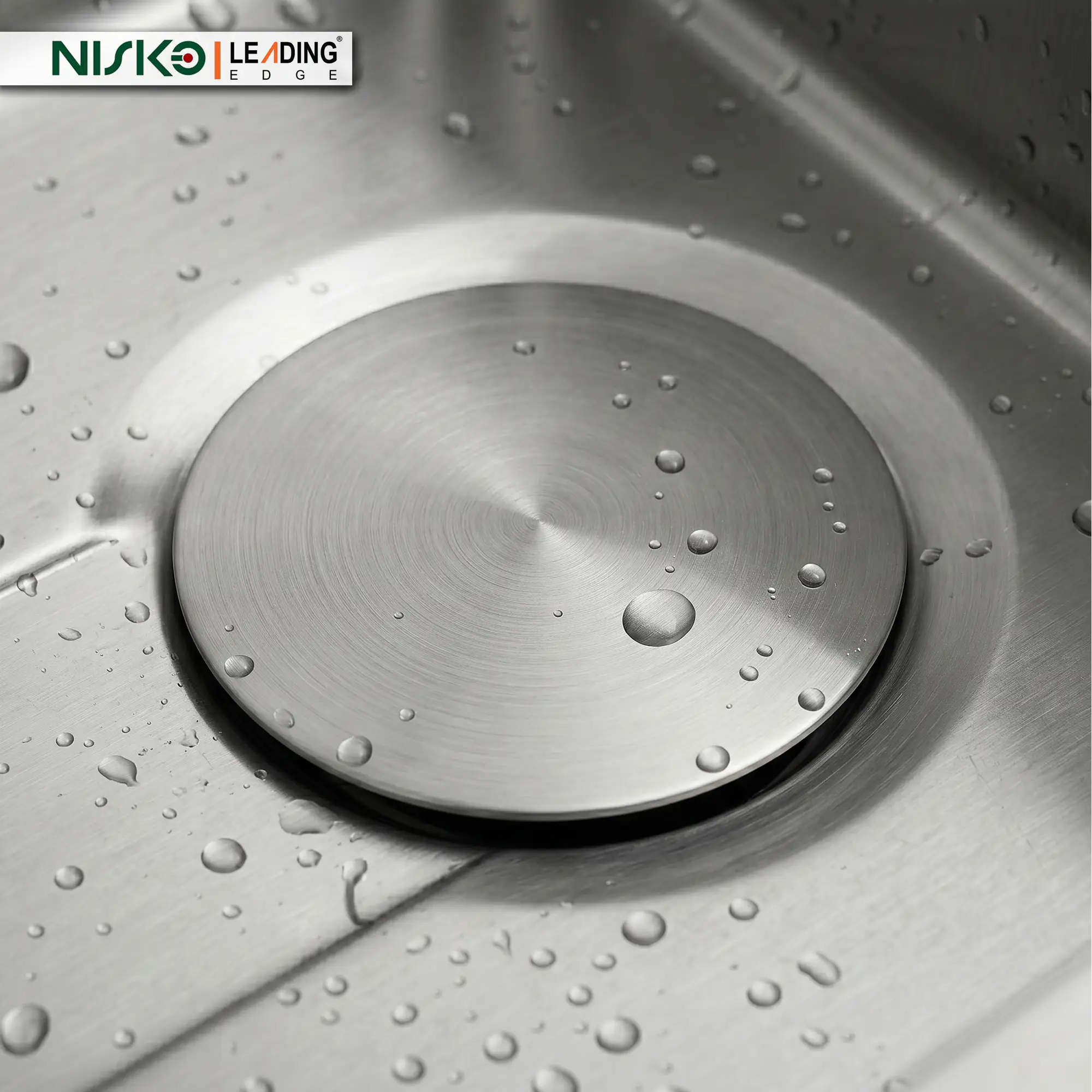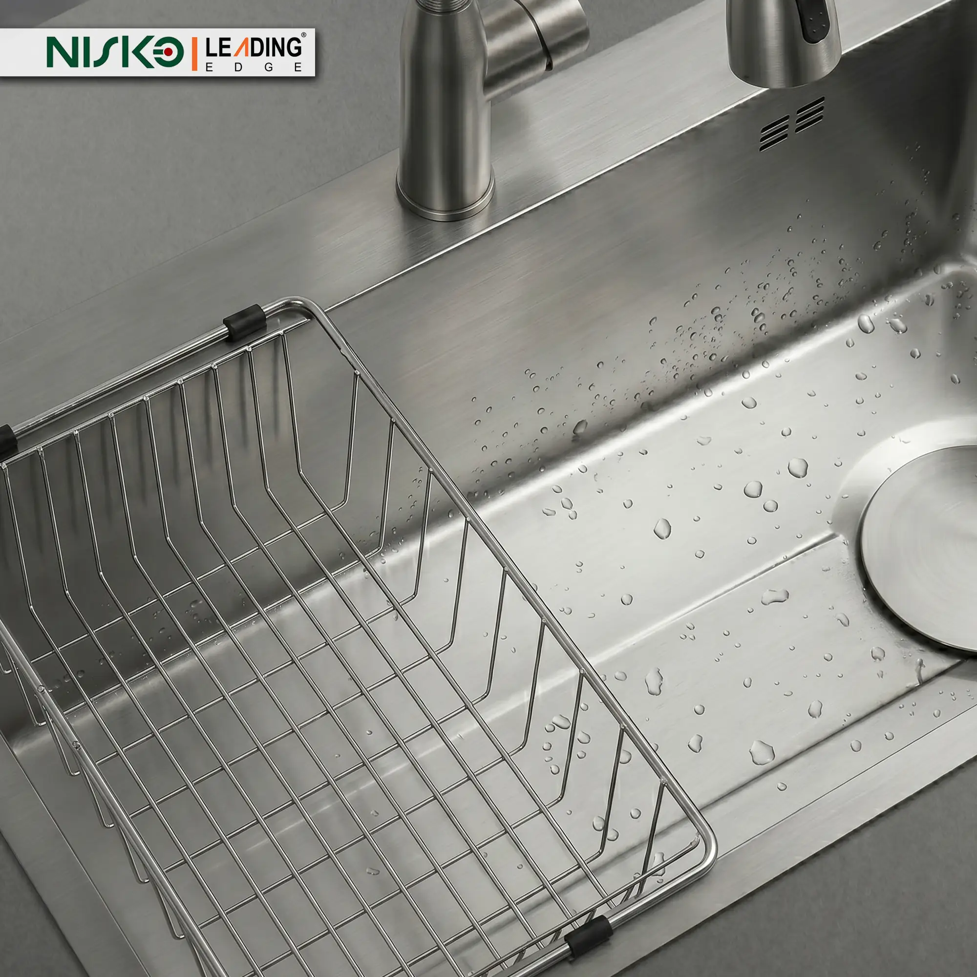 Premium Handmade SUS304 Construction Built for lasting durability and elegance, this Nisko kitchen sink is meticulously handmade from high-grade SUS304 stainless steel. It boasts a heavy-duty thickness profile (3mm top lip / 0.7mm bowl) to prevent denting and noise. The surface is treated with a specialized “dot” texture in its original stainless steel color, which significantly improves resistance to scratches, stains, and visible watermarks.