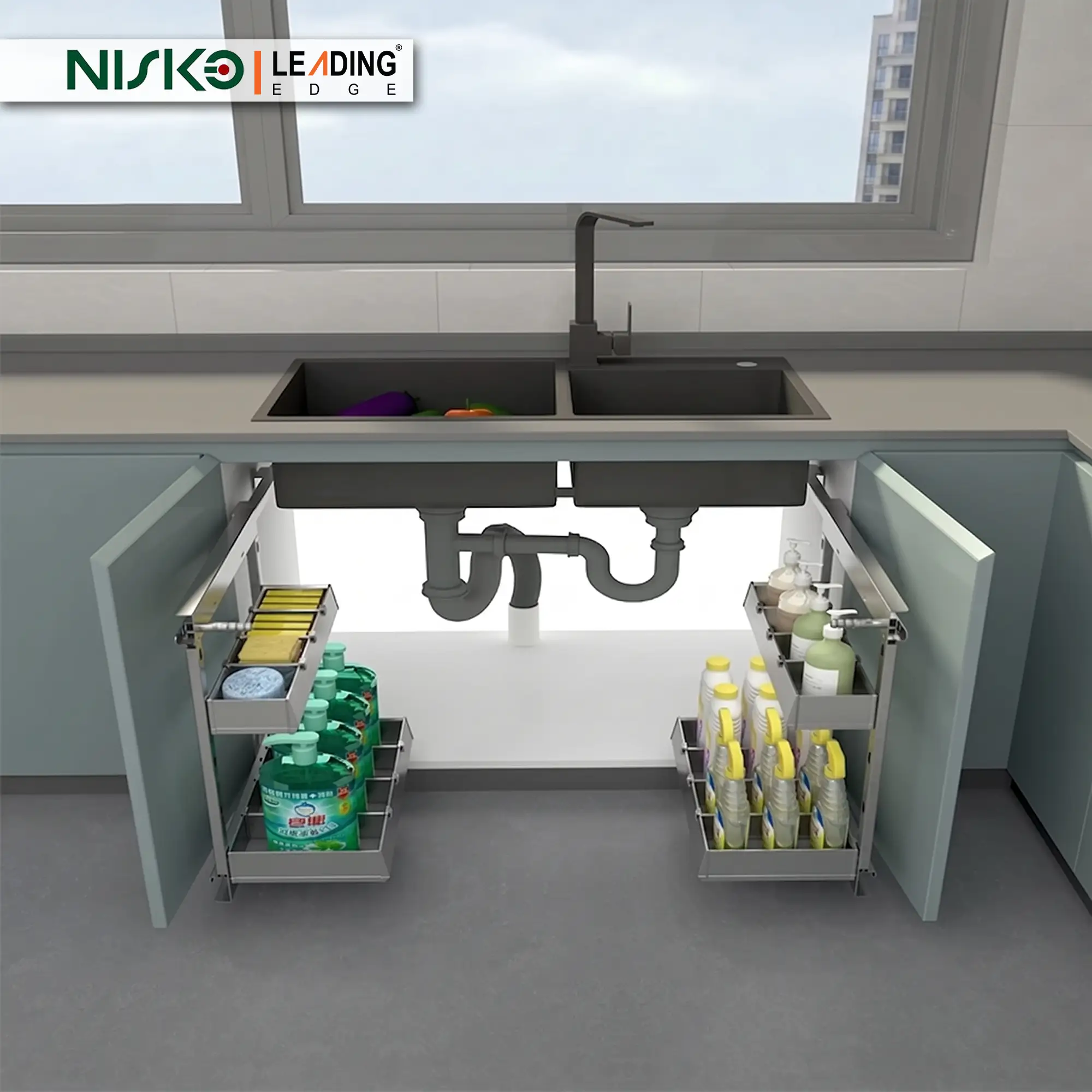 Ultimate Under-Sink Organization Transform the often cluttered and hard-to-reach area beneath your sink into a highly efficient storage zone with the Sink Basket Concealed GS05-04E1. This specialized dual-tier pull-out system is engineered to navigate around plumbing fixtures, providing a structured home for cleaning supplies, detergents, and sanitary products.