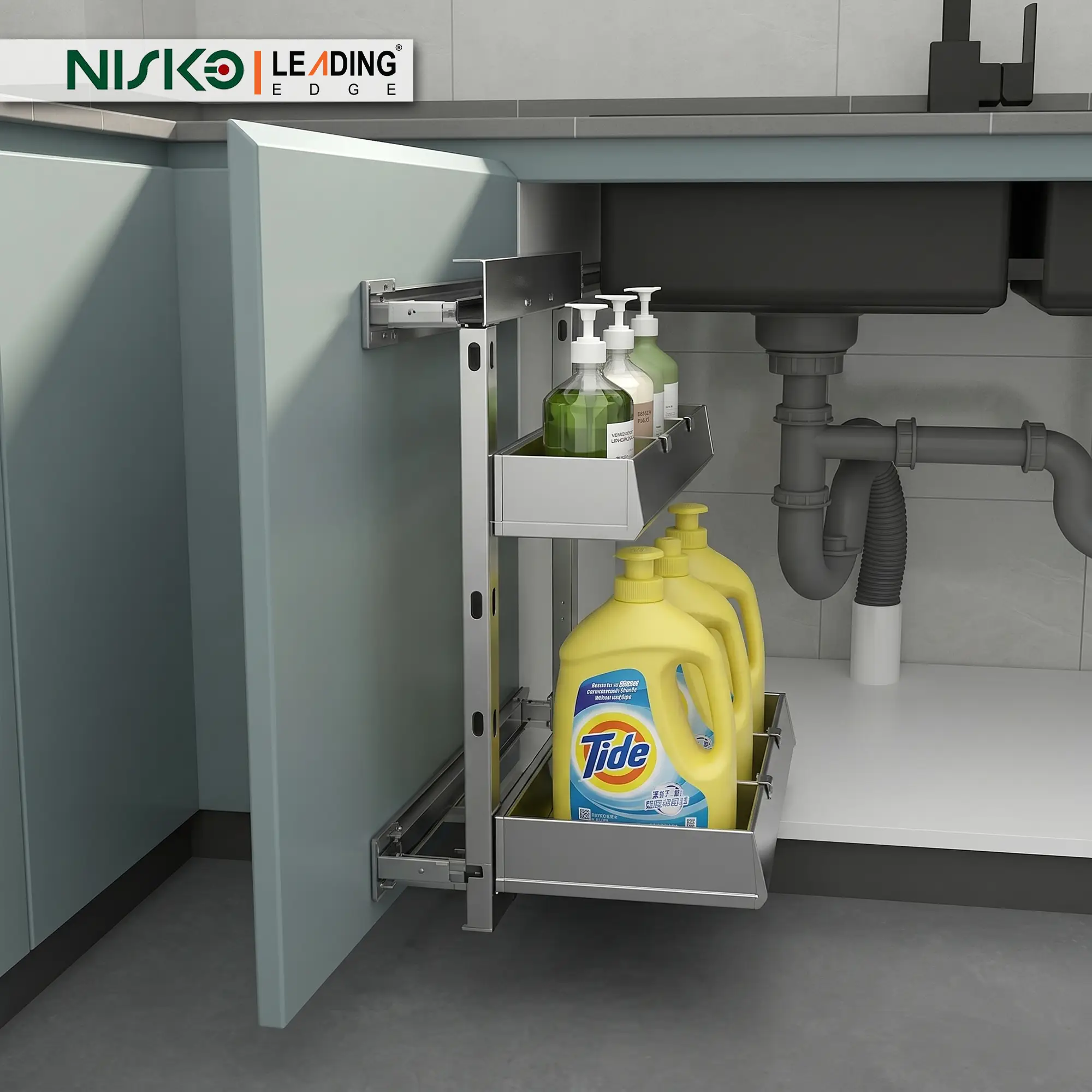 Smooth Operation & High Capacity Featuring a heavy-duty ball-bearing slide system, the entire unit glides out effortlessly to provide full visibility of your items. With a robust loading capacity of 15–35 kg, it securely holds heavy liters of detergent and bulk cleaning bottles. The adjustable shelves allow you to customize the layout to fit various container sizes, from tall sprays to small sponges.